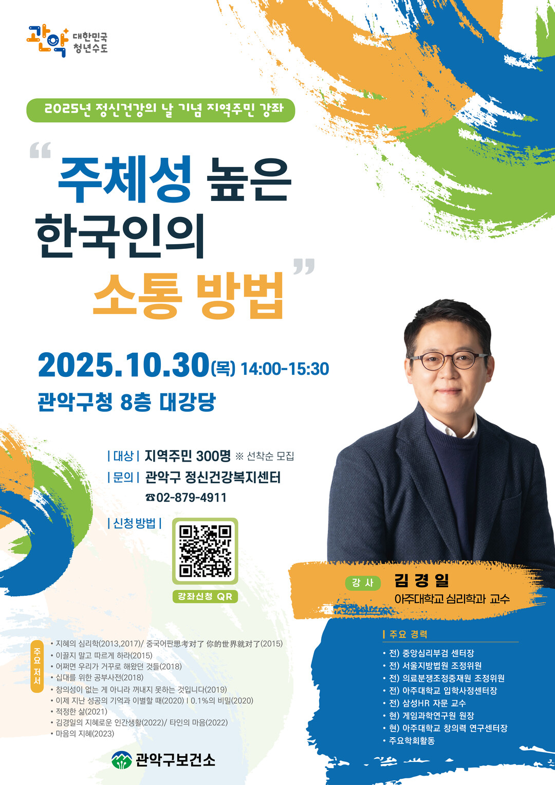 주체성이 높은 한국인의 소통 방법에 대한 특강은 30일 오후 2시 관악구청 대강당에서 진행될 예정이다.