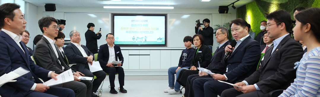 이날 참석자들은 간담회에 이어 한화가 진잠초의 유휴교실 정비해 학생들의 휴게공간으로 조성한 맑은 쉼터를 둘러보고 진잠초 운동장에서 진행된 코오롱의 찾아가는 친환경에너지 교육 수업을 참관했다.