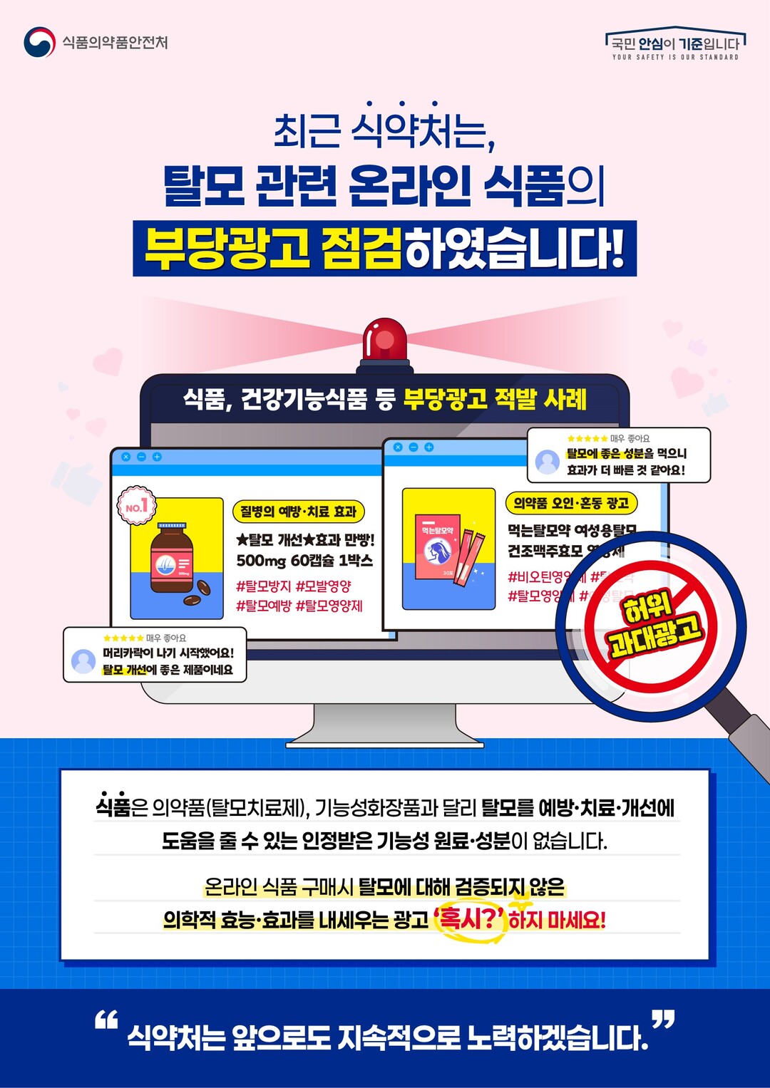 이슈앤/ 식품의약품안전처는 식품 또는 건강기능식품을 탈모 예방 등으로 광고하여 판매하는 온라인 게시글을 집중 점검한 결과 「식품 등의 표시‧광고에 관한 법률」을 위반한 192건을 적발해 방송통신심의위원회에 해당 게시물 차단을 요청하고 관할 지방자치단체에 행정처분 등을 요청했다고 밝혔다.