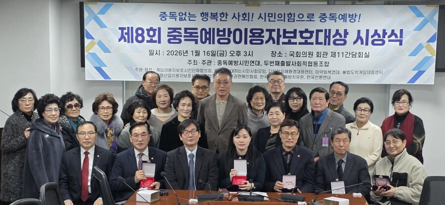 이슈앤/ 도박·게임·마약·알코올 등으로 인해 발생 되는 중독 및 사회적 폐해 예방을 위해 ‘입법청원, 제도개선, 감시고발, 예방 활동’에 앞장서고자 출범한 ‘중독예방시민연대’(상임대표 김규호 목사, 연대)가 16일 오후 국회의원회관 제11간담회실에서 제8회 ‘중독예방이용자보호대상’ 시상식을 개최했다.