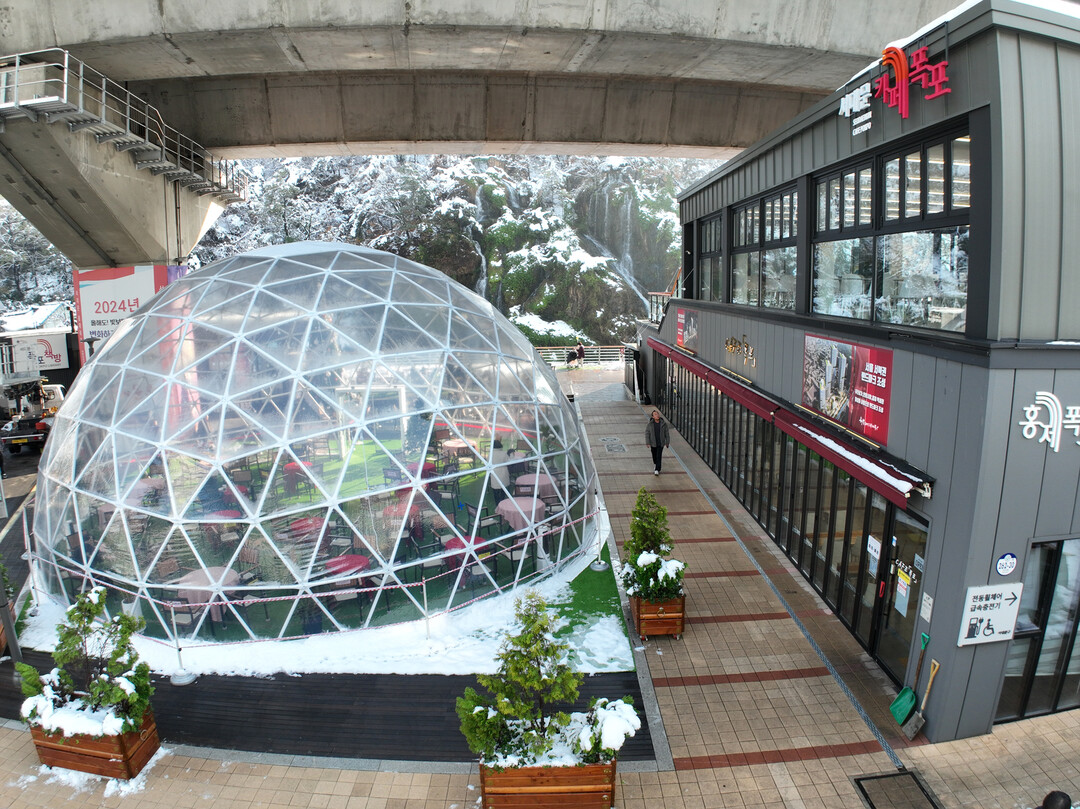 한편 구는 최근 카페폭포 앞에 추위를 막아 주는 대형 돔(사진)을 설치해 겨울철 명소로 많은 인기를 모을 전망이다.