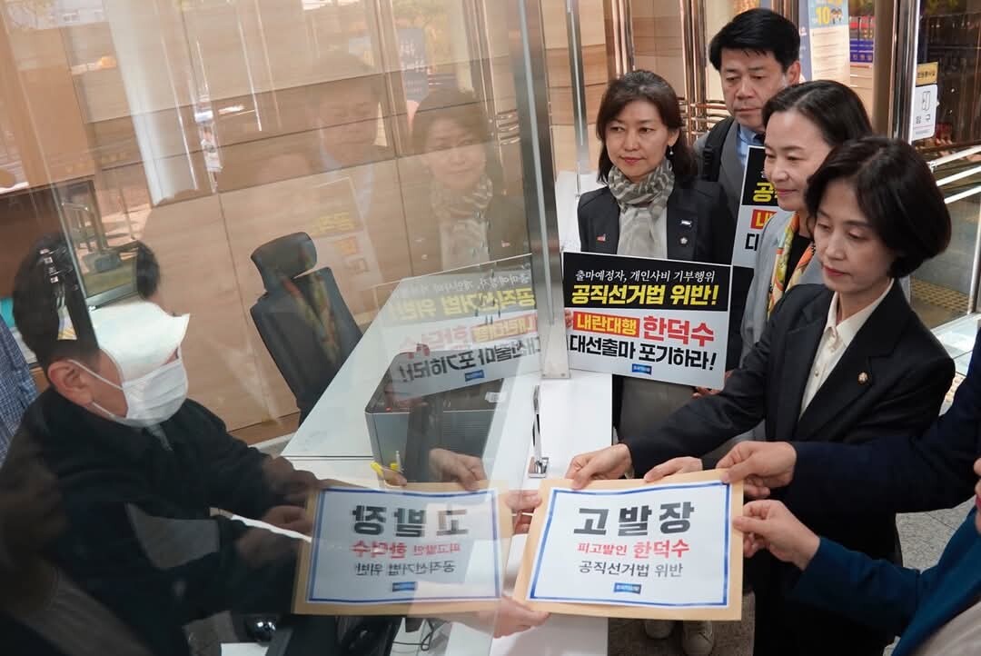 혁신당 의원들은 이날 경찰청 국가수사본부에 한 전 총리 고발장을 제출하며 "출마 예정자 신분으로 최근 개인 기부 사실을 대대적으로 홍보했던 한덕수는 공직선 거법 제113조 위반이 명확하다"고 주장했다.