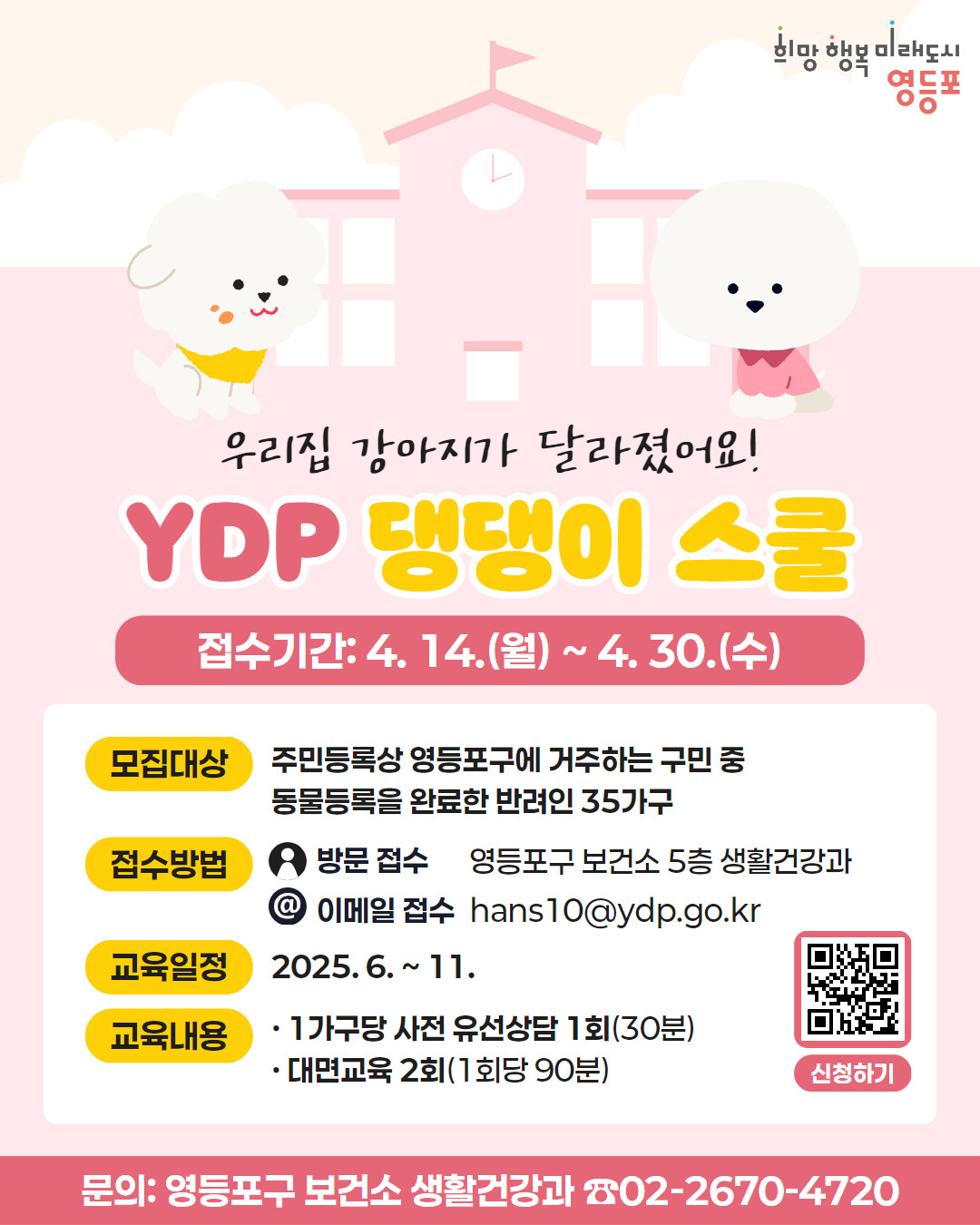 이슈앤/ 서울시 영등포구가 성숙한 반려문화 정착을 위해 문제행동을 가진 반려견을 대상으로 찾아가는 훈련 프로그램 YDP 댕댕이 스쿨을 신규 운영하고 오는 30일까지 참여 가구를 모집한다고 밝혔다.
