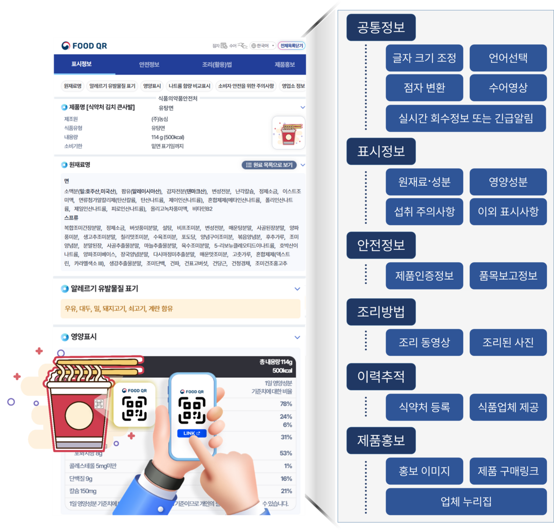 참고로 지난 8월 29일 「식품 등의 표시·광고에 관한 법률 시행규칙」과 세부 표시 기준(고시)이 개정·시행됨에 따라 식품의 제품명, 소비기한, 알레르기 유발 물질 등 중요한 정보는 현품 포장지에 크게 잘 보이게 표시하고 나머지 정보는 푸드 QR 등 e 라벨로 정보를 제공할 수 있다.