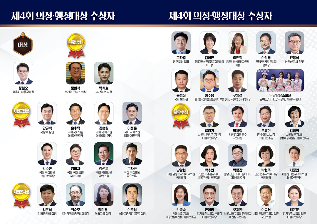 이슈앤/ 한국언론연대 주관으로 진행되는 제4회 의정-행정 대상 시상식이 22일 오전 10시부터 서울 프레스센터 20층 국제회의장에서 개최된다.