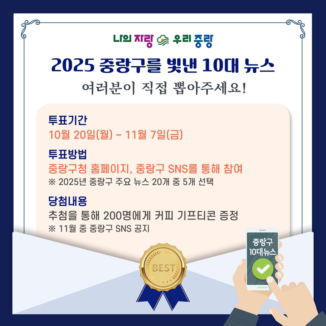 이슈앤/ 서울시 중랑구는 2025년 한 해를 빛낸 대표 정책과 사업을 구민이 직접 선정하는 2025 중랑구를 빛낸 10대 뉴스 온라인 주민 투표를 20일부터 오는 11월 7일까지 실시한다.