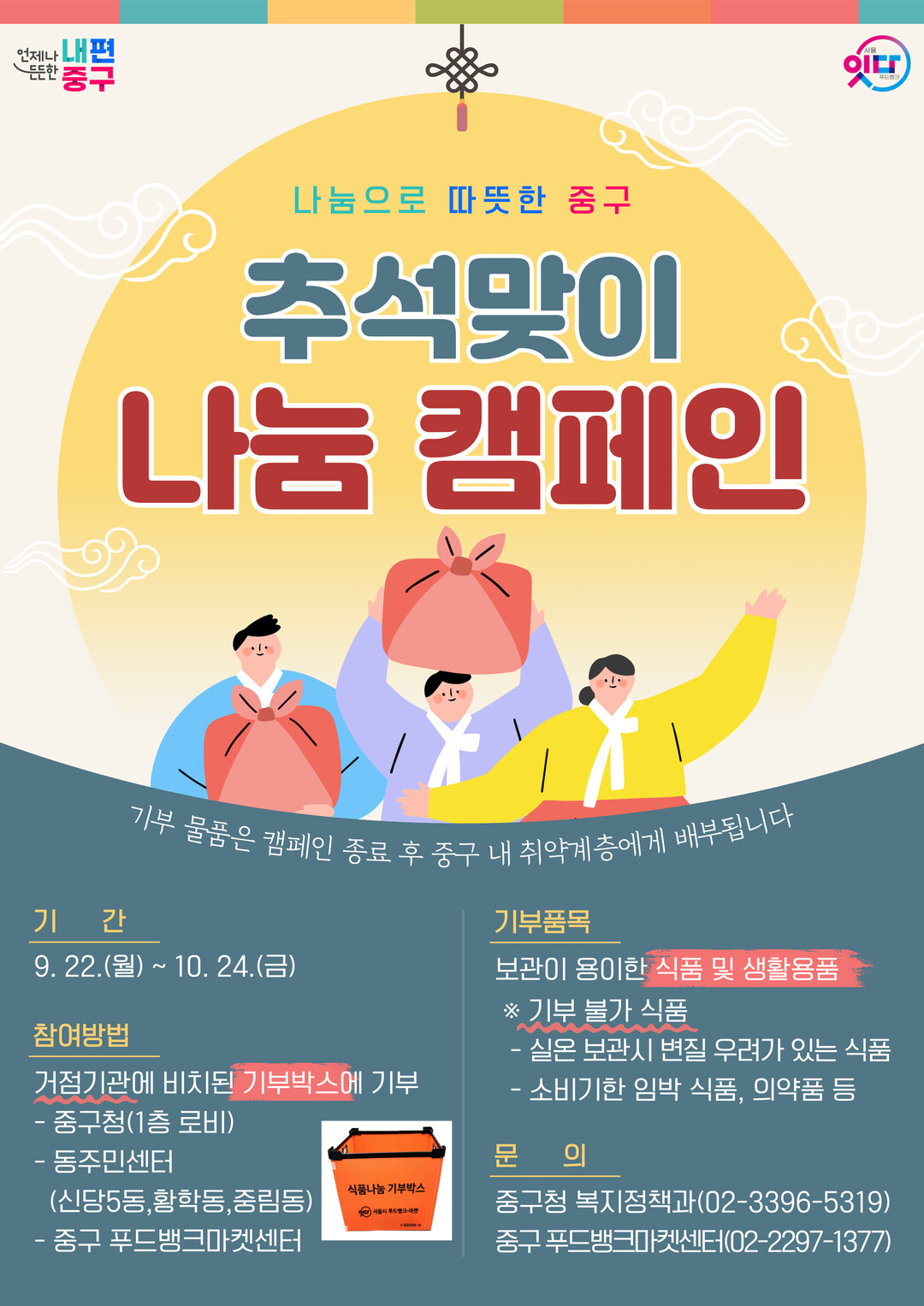이슈앤/ 서울시 중구는 지난 22일부터 오는 10월 24일까지 2025 추석맞이 나눔 캠페인을 진행한다고 30일 밝혔다.