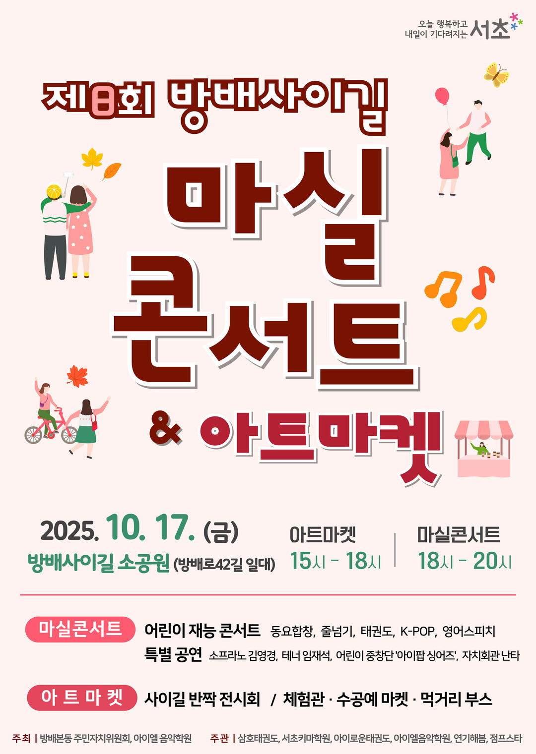 이슈앤/ 서울시 서초구는 17일 방배로42길에 위치한 방배사이길 소공원에서 제8회 방배사이길 마실콘서트&아트마켓을 개최한다고 16일 밝혔다.