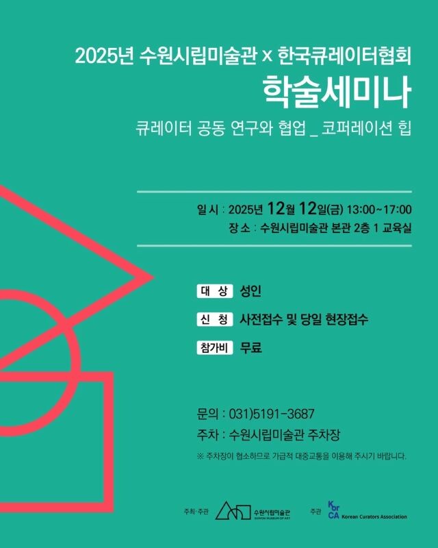 세미나는 60명 정원으로 무료로 운영된다. 수원시립미술관 누리집(https://suma.suwon.go.kr)에서 사전접수를 통해 참여 가능하며 잔여석에 따라 현장에서 참여할 수 있다.