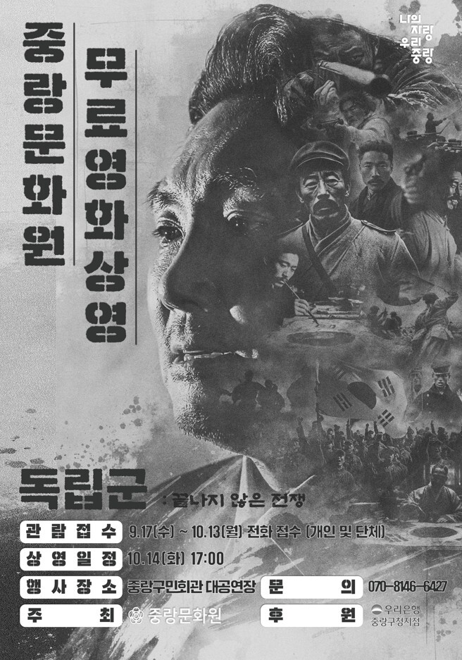 류경기 구청장은 “광복 80주년을 맞아 열리는 이번 <독립군> 상영 행사가 구민들에게 독립운동 정신을 되새기고 공동체의 의미를 다시금 깨닫게 하는 계기가 되기를 바란다”고 전했다.