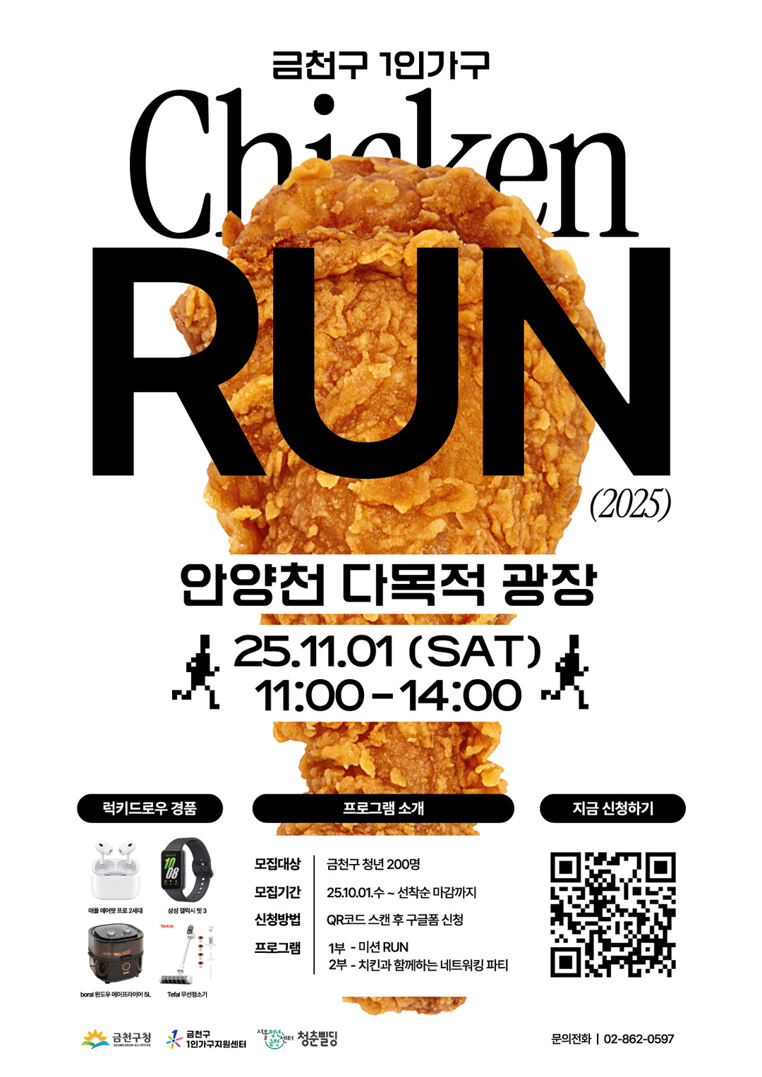 이슈앤/ 서울시 금천구는 오는 11월 1일 오전 11시 안양천 농구장에서 청년 1인가구를 대상으로 걷기 챌린지 치킨런 행사를 개최한다고 29일 밝혔다.