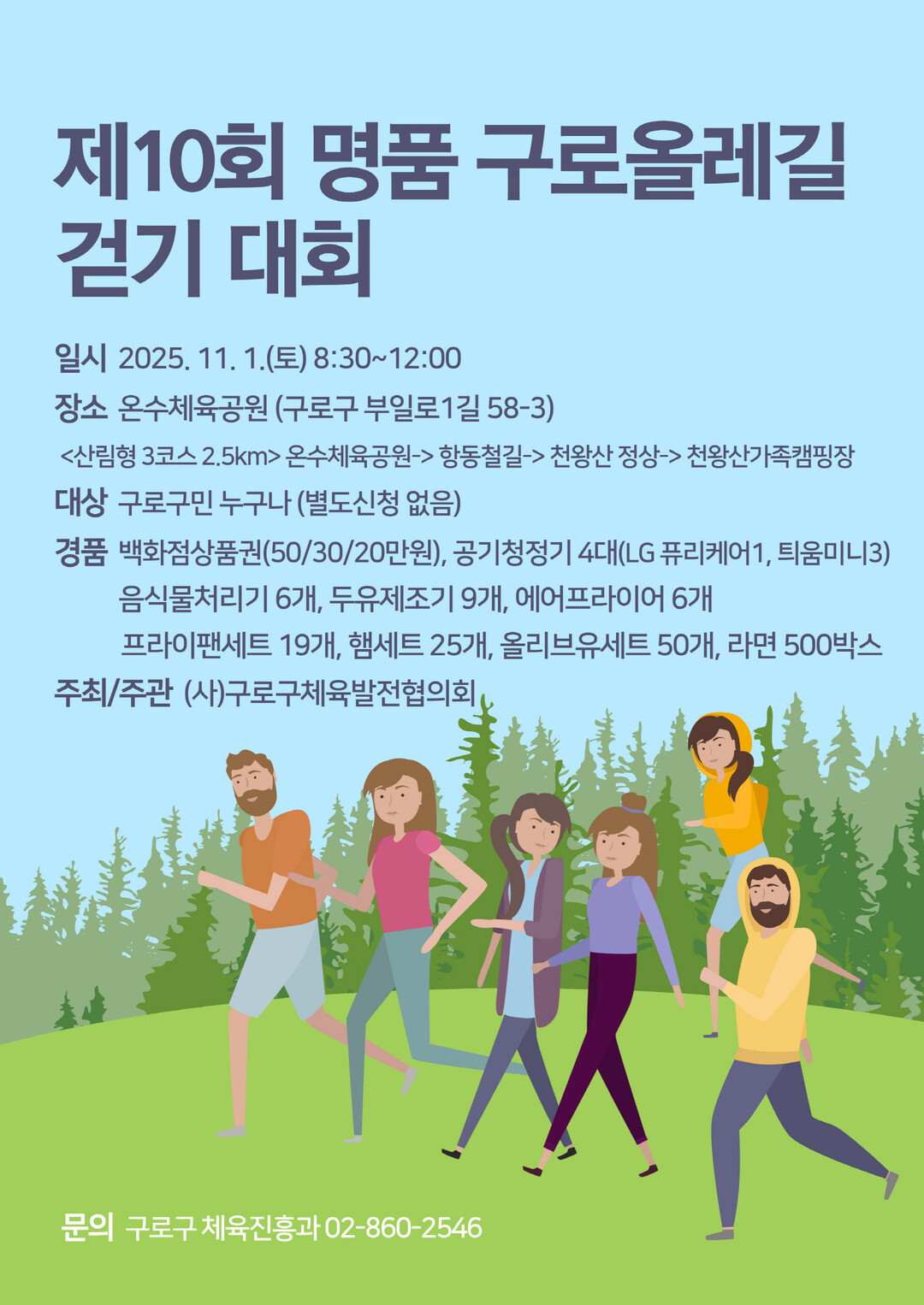 이슈앤/ (사)구로구체육발전협의회가 주최·주관하고 구로구가 후원하는 제10회 명품 구로올레길 걷기 대회가 오는 11월 1일 오전 8시 30분 온수체육공원에서 개최한다.
