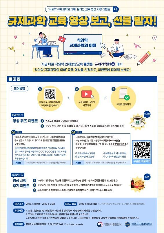 이번 이벤트*는 ‘규제과학IN(人)’에서 ‘식의약 규제과학의 이해’ 영상을 시청한 후 퀴즈를 풀거나 인증 사진과 함께 시청 후기를 작성하면 된다. 참가자 중 추첨을 통해 소정의 선물이 제공된다.