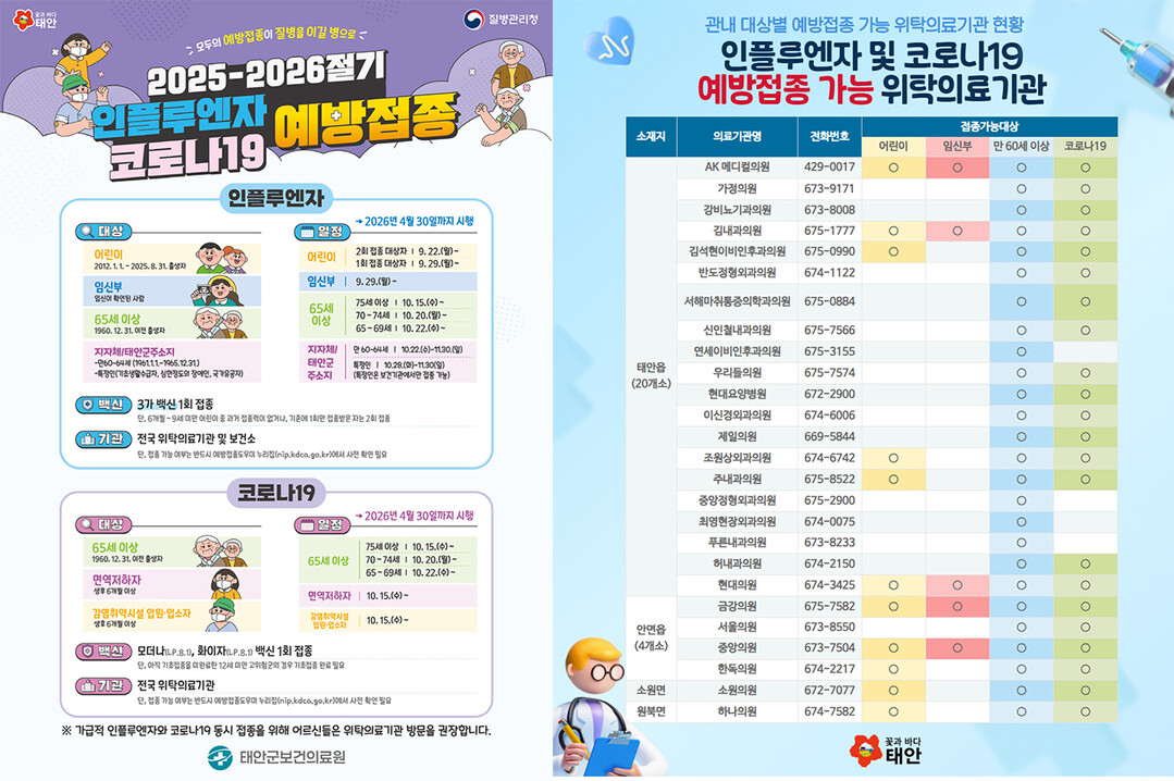 태안군 관계자는 “인플루엔자 예방접종은 겨울철 건강을 지키는 가장 확실한 방법으로 특히 면역력이 떨어지는 어르신은 예방접종을 꼭 받을 것을 권장한다”며 “안전한 접종을 통해 지역사회 내 인플루엔자 감염이 최소화될 수 있도록 적극 노력하겠다”고 전했다.