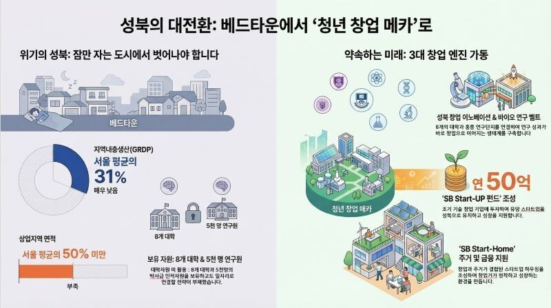 그는 "성북구 지역내총생산(GRDP)은 서울 평균의 약 31% 수준에 머물러 있으며 상업지역 면적 역시 서울 평균의 절반에도 미치지 못한다"며 "이는 성북이 ‘직·주·락’ 중 직(職) 기능이 취약한 불균형 구조를 보여주는 대표적인 사례로 ‘이제는 일하고, 머물고, 소비하는 구조로 도시 체질’을 바꿔야 할 시점"을 강조했다.