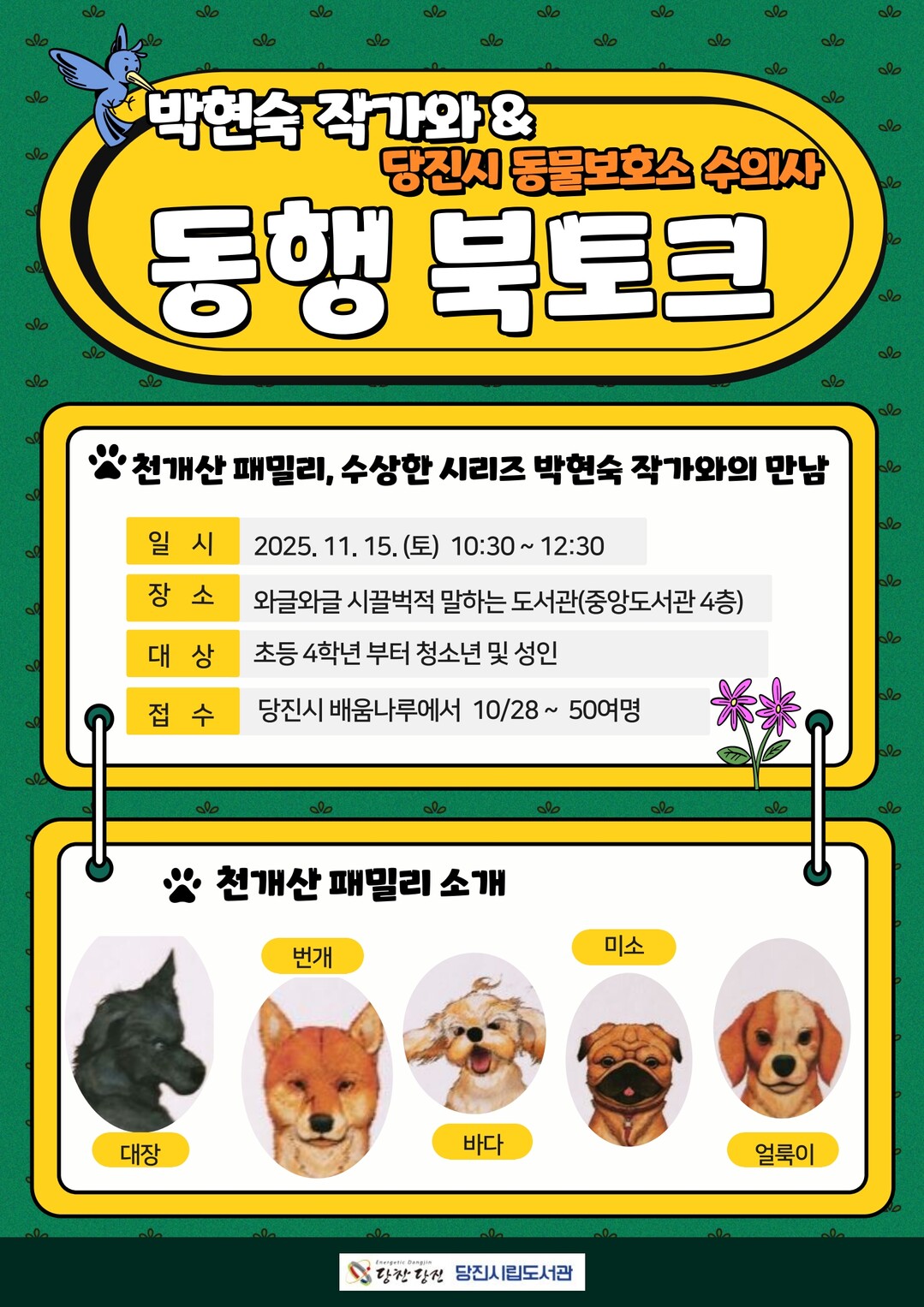 이번 행사는 북토크 형식의 특강으로 천개산 패밀리의 저자 박현숙 작가를 초청해 반려동물과 유기 동물을 주제로 진행한다.
