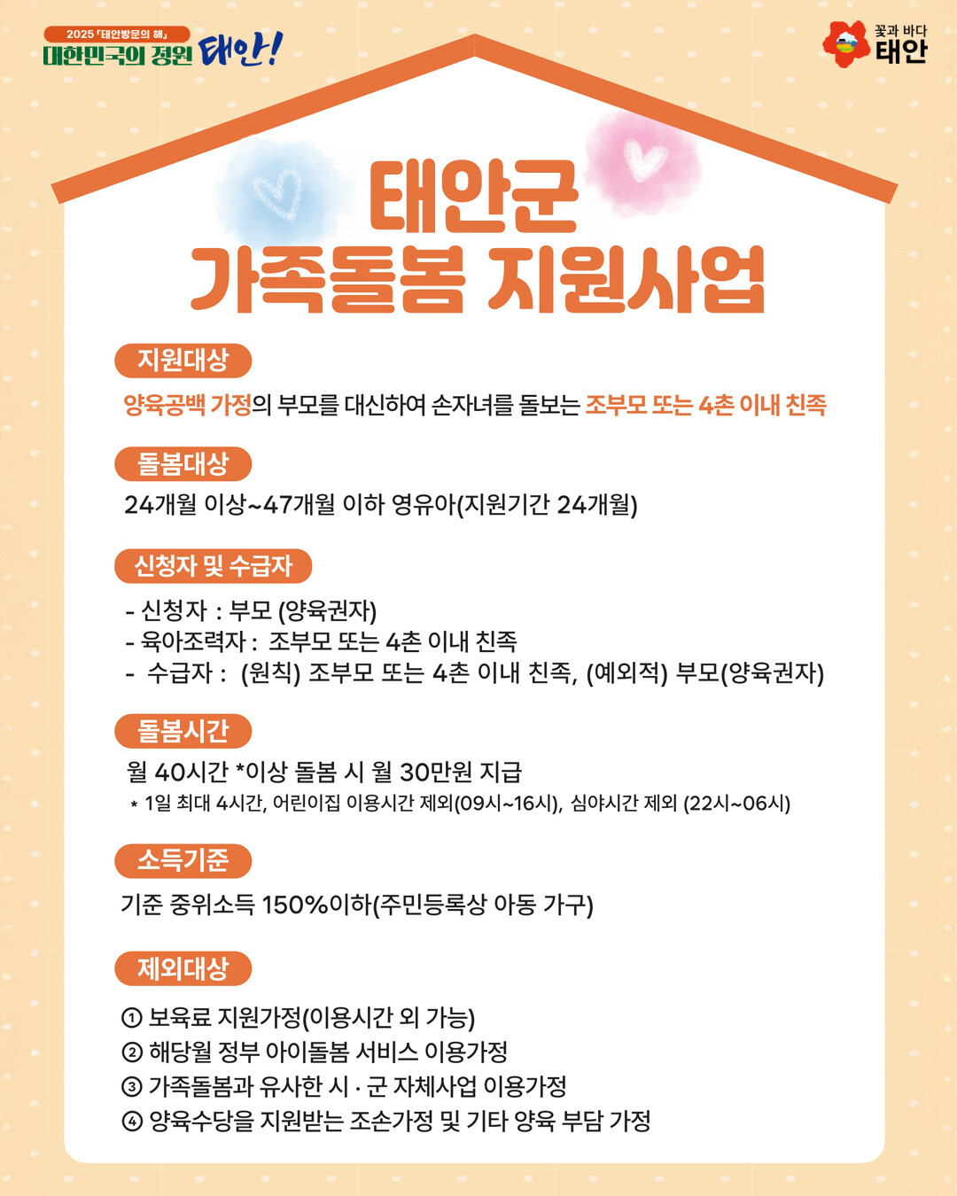 이슈앤/ 충남 태안군은 사촌 이내 친족이 양육 공백 가정의 영유아를 월 40시간 이상 돌볼 경우 월 30만 원의 돌봄 비용을 지원하는 가족돌봄 지원 사업을 시행한다고 15일 밝혔다.