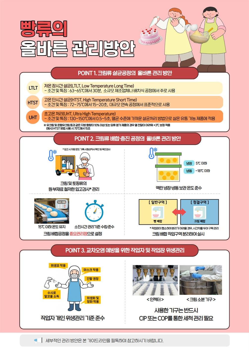빵류 경우는 빵에 충진하는 크림은 단백질과 지방 함량이 높아 미생물이 쉽게 증식하므로 살균하는 것을 권장한다.