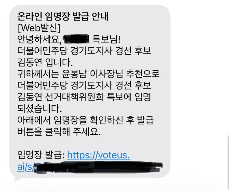 실제 확인된 사례에 따르면, ‘온라인 임명장 발급 안내’라는 제목의 문자 메시지에는 더불어민주당 경기도지사 경선 후보 김동연 이름으로 “귀하께서는 윤봉남 경기도자원봉사센터 이사장 추천으로 김동연 선거대책위원회 특보에 임명되셨다”는 내용과 함께 임명장 발급 링크가 포함되어 있었다.