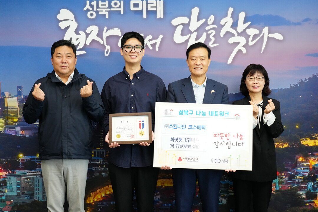 이슈앤/ 서울시 성북구가 지난 14일 지역사회 이웃들을 위해 화장품 151상자를 기부한 ㈜스킨나인코스메틱에 감사장을 전달하며 따뜻한 나눔의 자리를 마련했다.