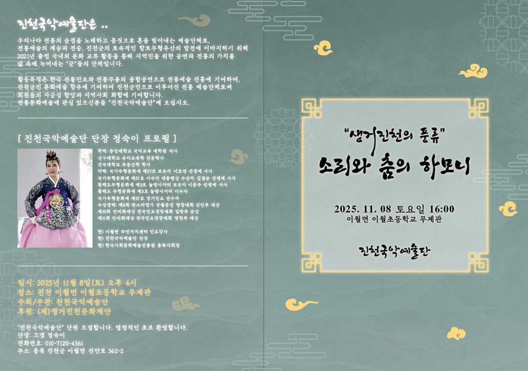 이슈앤/ (재)생거진천문화재단은 오는 11월 8일 오후 4시 이월초등학교 무제관에서 진천국악예술단이 진천의 풍류, 소리와 춤의 하모니 공연을 개최한다고 밝혔다.
