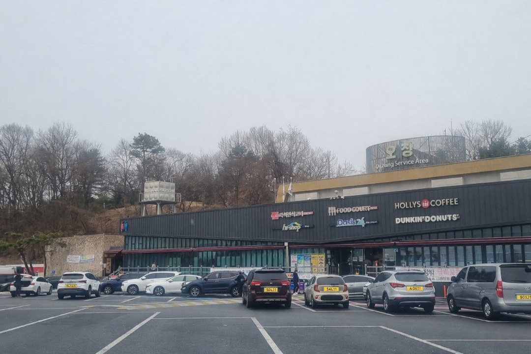 이슈앤/ 봄비가 아침을 적시는 가운데 오창휴게소의 아침을 밝히고 있다.