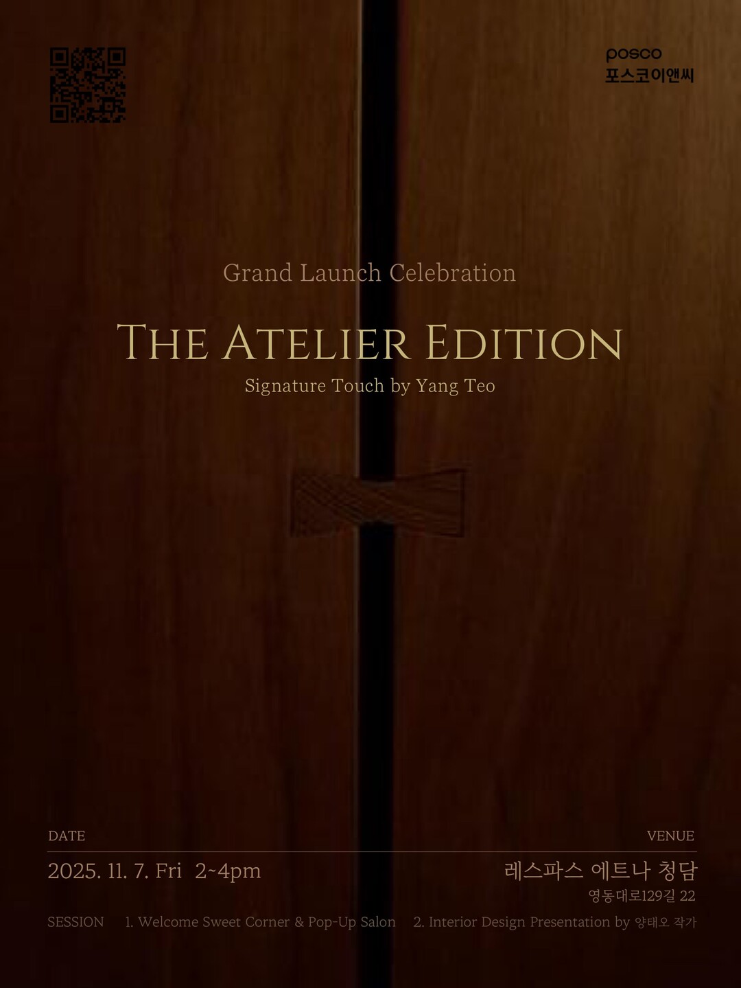이슈앤/ 포스코이앤씨는 세계적인 인테리어 디자이너 양태오 작가와 함께 개발한 하이엔드 인테리어 상품 아틀리에 에디션을 오는 11월 7일 서울 레스파스 에트나 청담에서 런칭 행사를 열고 공식 공개한다.