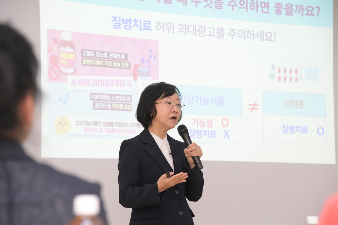 이날 교육은 복지관을 이용하는 어르신 약 40명을 대상으로 건강기능식품의 정의와 올바른 구매‧섭취요령, 의료기기의 개념과 안전한 구입‧사용 요령, 허위·과대광고 피해예방 방법 등의 내용으로 진행됐다.