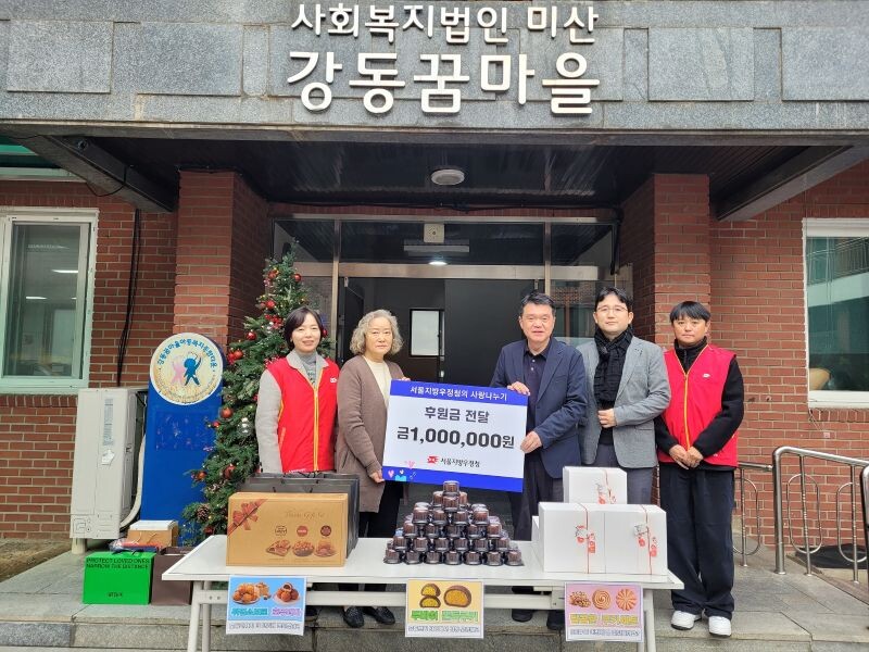 서울지방우정청은 ‘강동꿈마을’에 매년 정기적으로 후원을 이어오고 있다. 올해에도 연말연시 크리스마스를 맞아 후원금 100만 원과 함께 우체국쇼핑 상품과 쿠키를 전달하며 아이들에게 온정을 전했다.