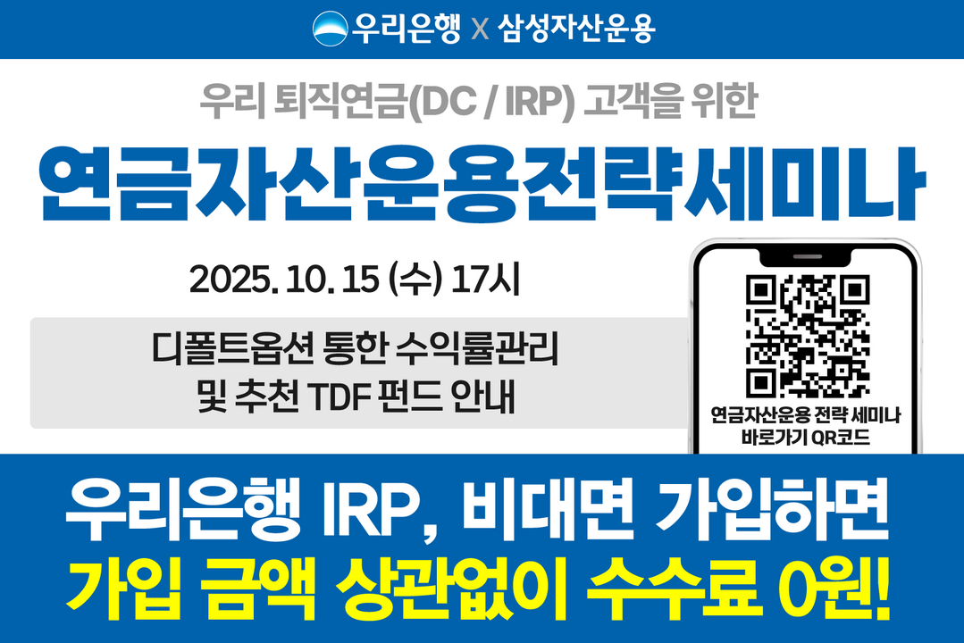 세미나 참여는 우리WON뱅킹 앱 메뉴-새소식-퇴직연금(IRP/DC) 「연금자산·운용전략」 비대면 라이브 세미나 안내 공지를 클릭하거나 은행 홈페이지 홍보센터에 게시된 QR코드를 통해 접속할 수 있다.