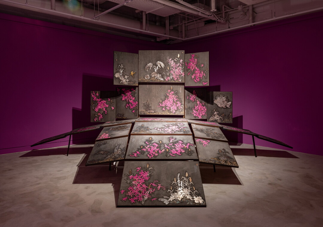 김소산의 <기계로 물든 꽃들>(2025)은 작업을 시작한 봄에 피었던 꽃과 잡초를 에칭 기법과 세밀한 페인팅으로 그리고 이를 꽃이 피어나는 형태의 입체 구조물로 설치하여 다층적인 시선의 흐름을 만들어낸 작품이다.