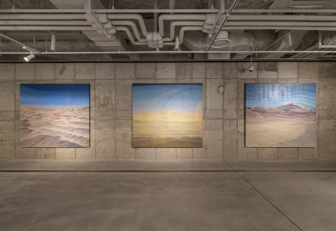 바람, 안개, 진동, 소리와 같이 비가시적인 풍경을 담아온 방수연은 자신이 서 있었던 사막과 모래산에서 발견했던 작은 입자들과 빛의 파장을 추상적인 패턴으로 겹겹이 그린<모래길>(2025)과 <유령 곡선>(2025) 을 선보인다.