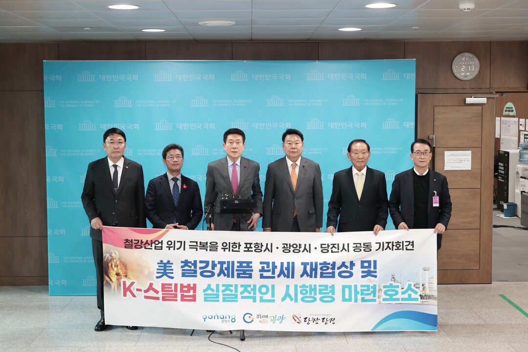 12일 서울 국회 소통관에서 열린‘당진·포항·광양 철강도시 공동기자회견’에서 세 도시는 미국의 고율 철강제품 관세 재협상과‘K-스틸법’ 시행령 마련을 중심으로 한 범정부 차원의 특단 대책을 요구했다.