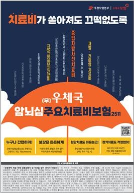 주요 질병(암·뇌·심장 질환)의 오랜 치료 기간 동안 경제적 부담을 덜고 치료에만 집중할 수 있도록 ‘(무)우체국암뇌심주요치료비보험’(이하 주요치료비보험)도 함께 출시된다.