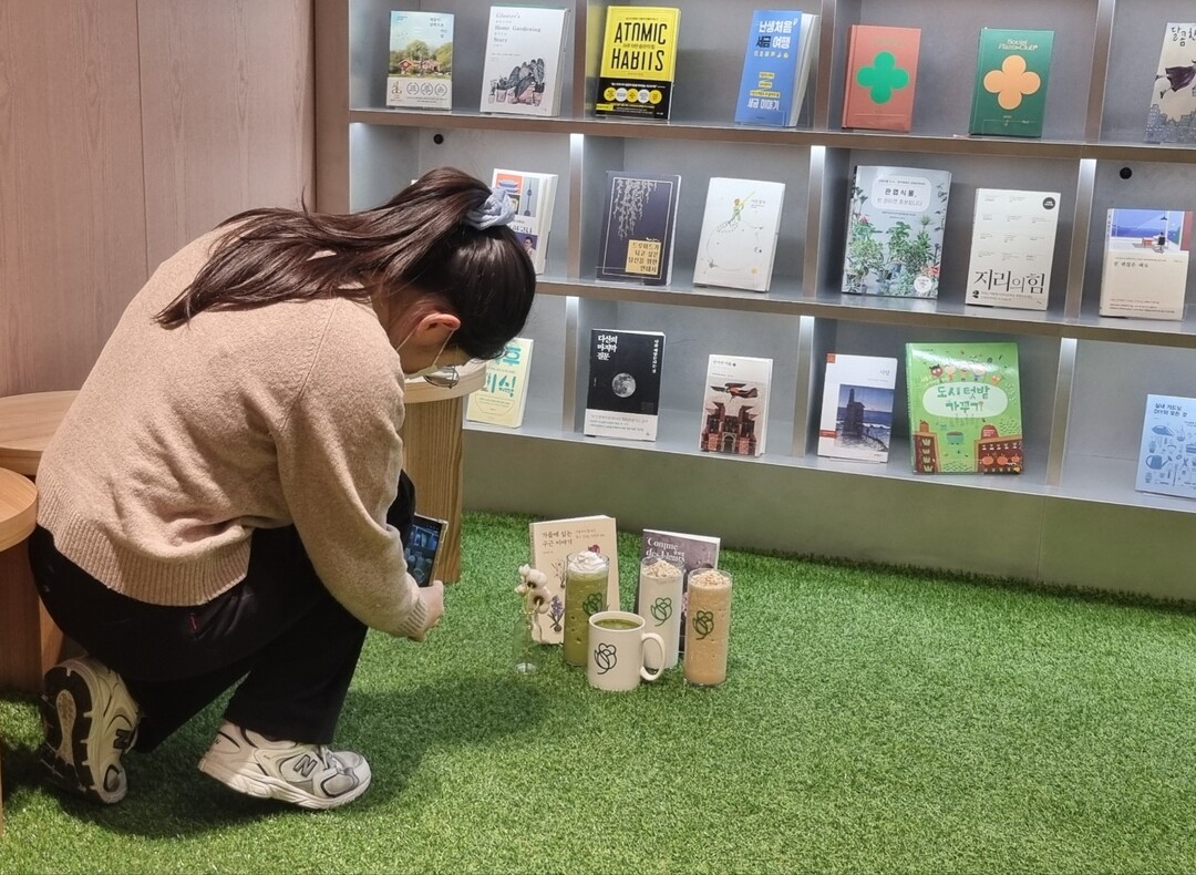 따뜻한 차 한잔을 두고 도란도란 이야기를 나누다, 라떼 몇 잔과 도서를 이리저리 놓으며 사진 찍는 모습.