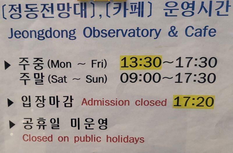 공휴일은 운영하지 않고 입장 마감은 5시20분까지이다.