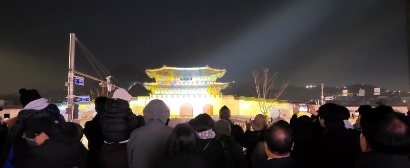이슈앤/ 광화문을 향해 쏘아지는 레이저 광선에 따라 술렁이는 인파
